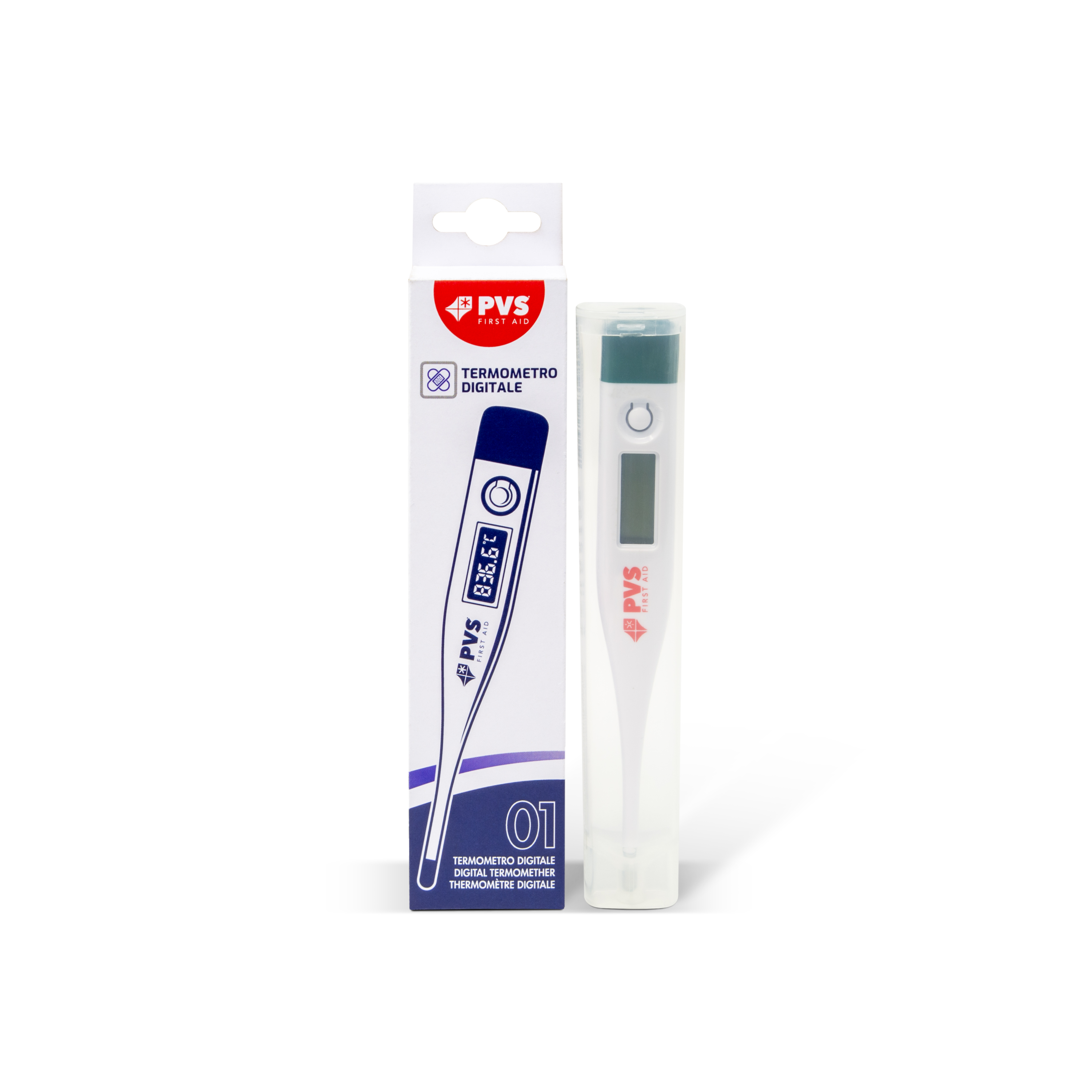 Digitales Fieberthermometer zur Messung der Körpertemperatur. Im Vergleich zum traditionellen Glasthermometer mit Quecksilber hat es mehrere Vorteile: einfaches Ablesen, Schnelligkeit, Genauigkeit, Zuverlässigkeit der Messung, Speicher und akustisches Signal am Ende der Messung.