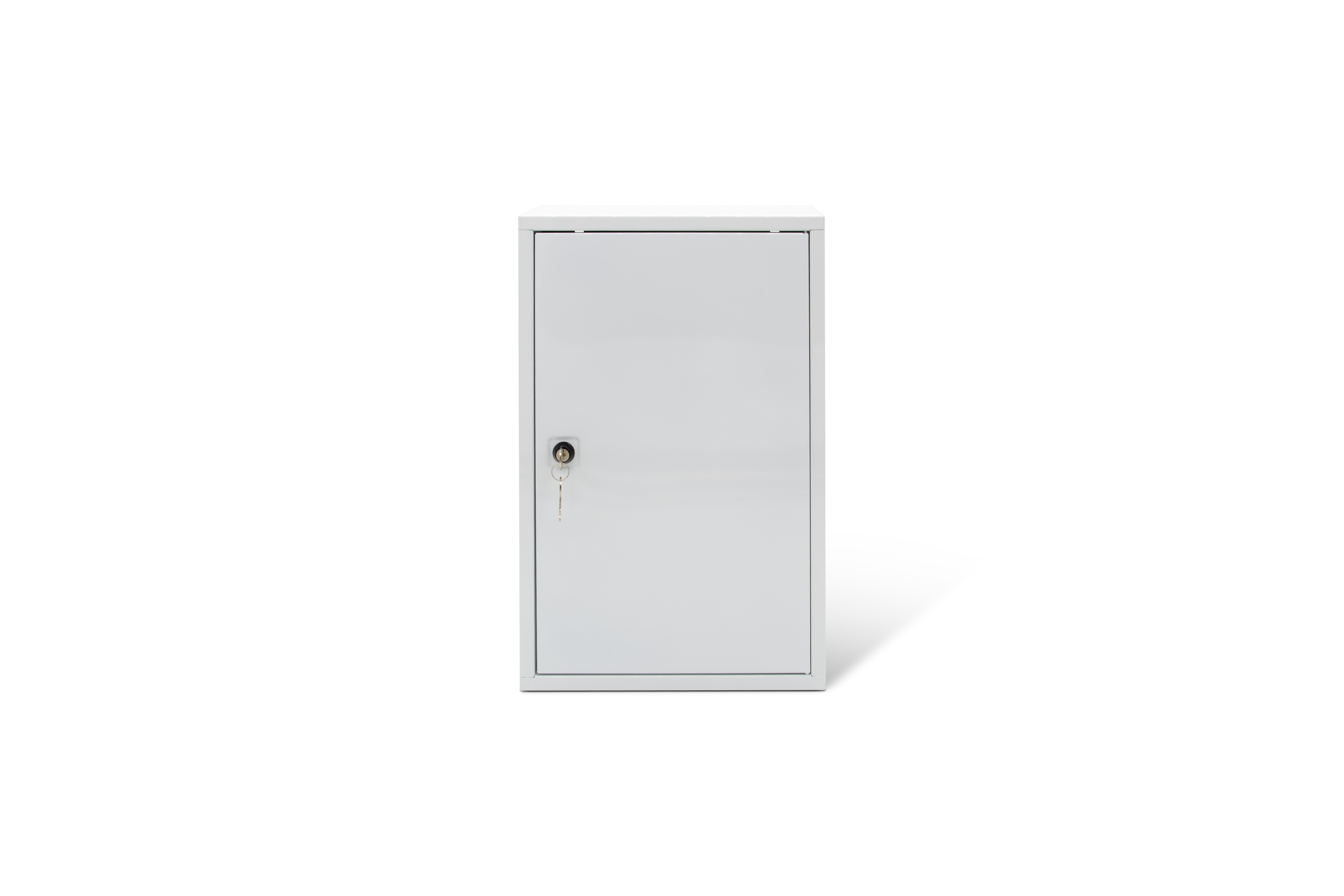 Mit weißem Epoxidpulver lackierter Metallschrank mit 3 Fächern, 2 Einlegeböden und Schlüsselschloss.