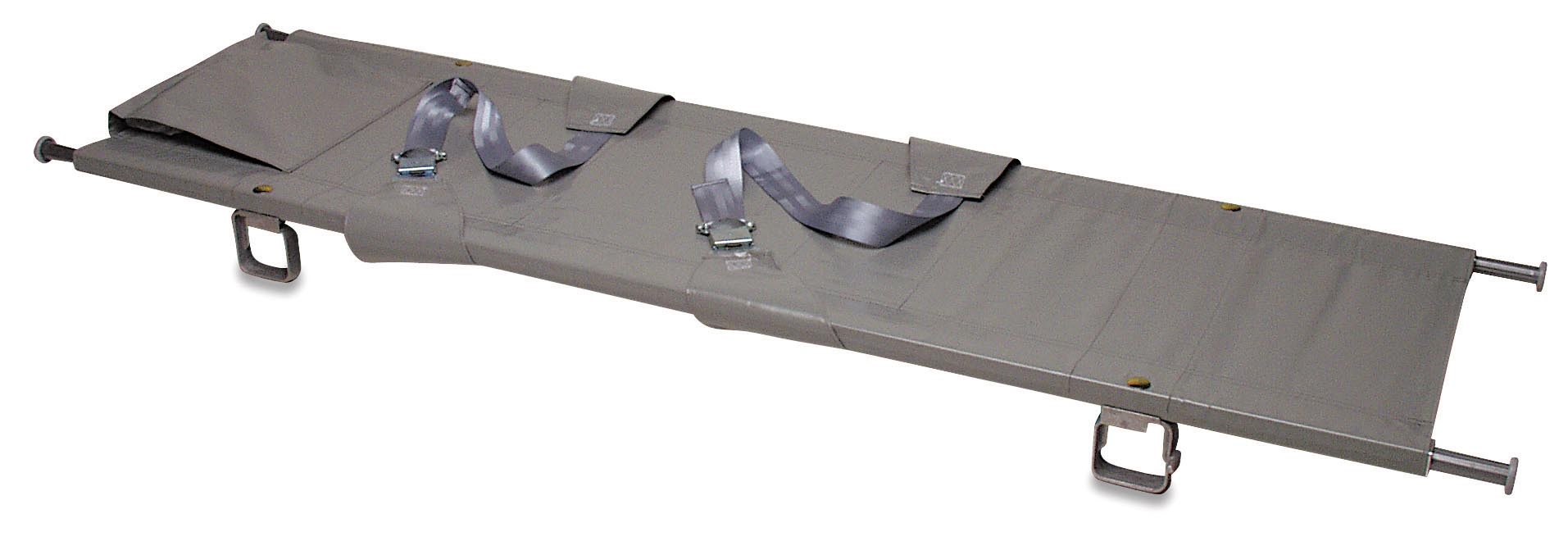 Faltbare Version Bahre in 4. Aus silikonisiertem Aluminiumprofil, korrosionsbeständig, mit Füßen zur Befestigung an den Schienen des Krankenwagens, abnehmbaren Griffen, selbstlöschendem und schimmelfreiem Stoff.